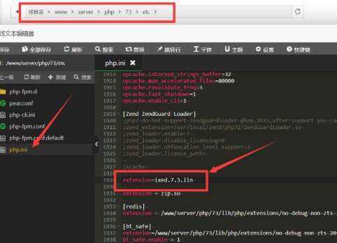 然后在/www/server/php/73/etc/php.ini文件内加入extension=ixed.7.3.lin